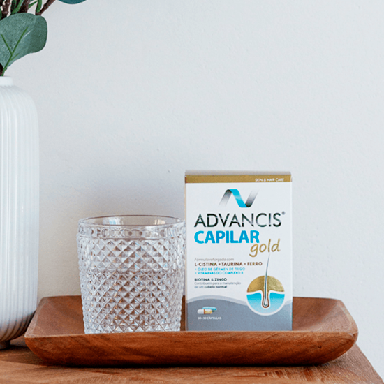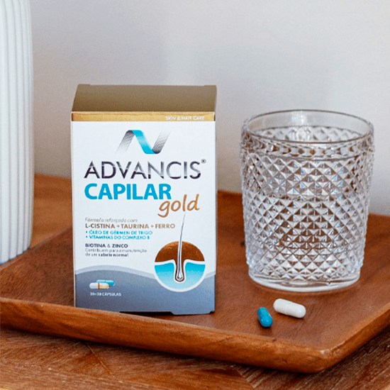 Advancis® Capilar Gold é um suplemento alimentar constituído por um complexo de proantocianidinas, óleo de gérmen de trigo associado a vitaminas do complexo B, zinco, Cobre, Ferro e Selénio.