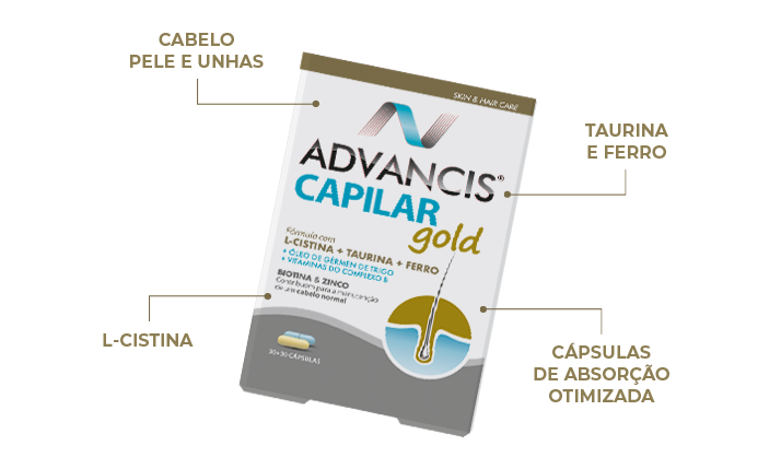 Advancis® Capilar Gold é um suplemento alimentar composto por duas cápsulas.